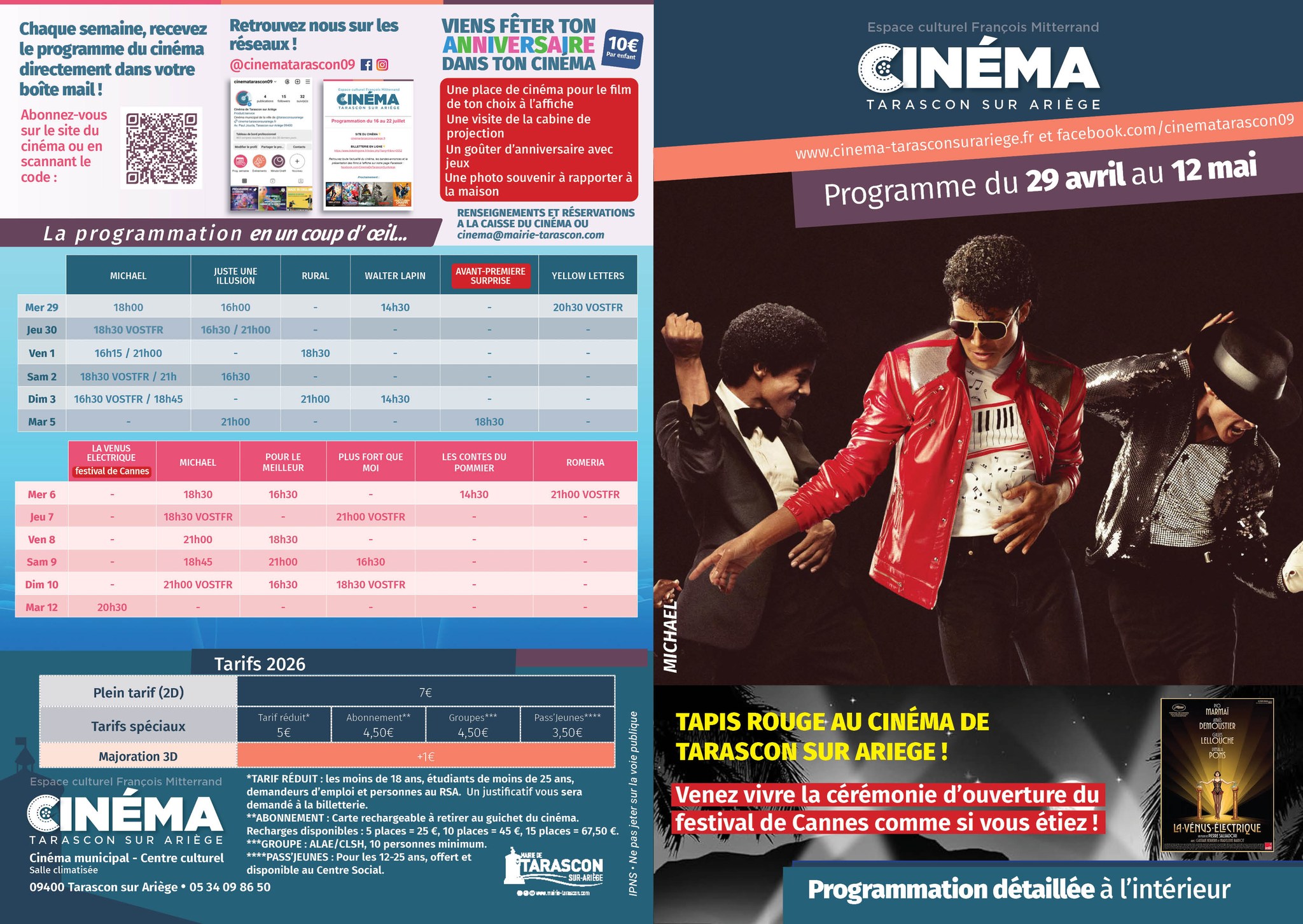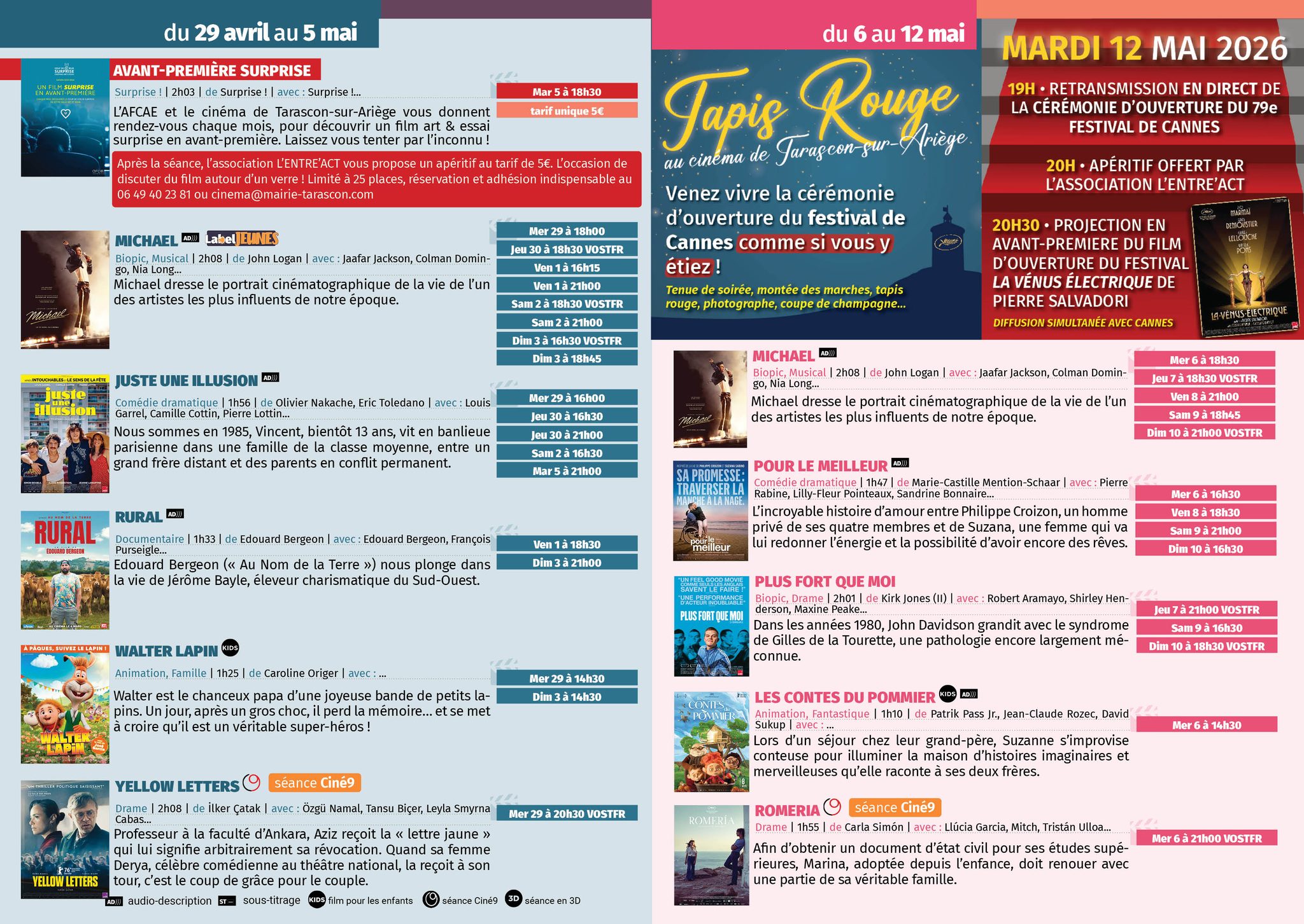Program available in the building or on the town hall website: https://cinema-tarasconsurariege.fr/