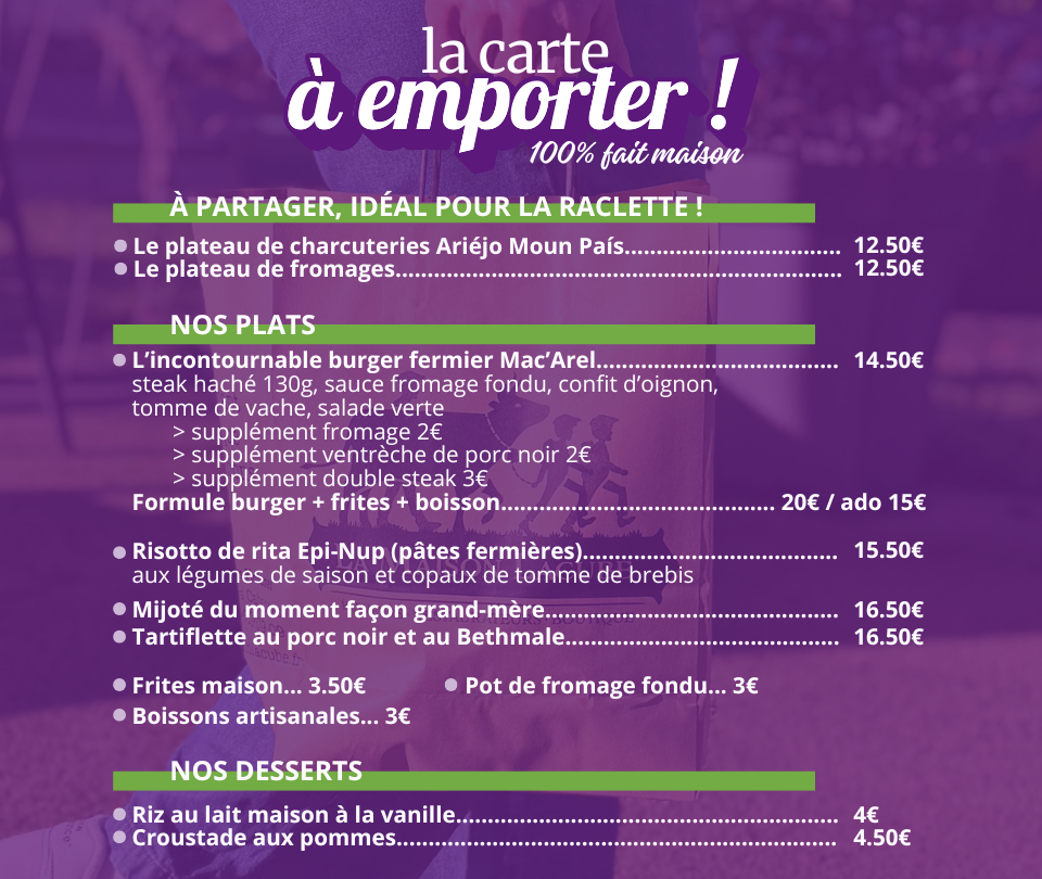 Specialties include superior grills and prepared dishes such as carpaccio, tartare, trout, salad with Ariège cheeses, as well as the famous Mac'Arel and Lucien. And don't miss our homemade desserts!